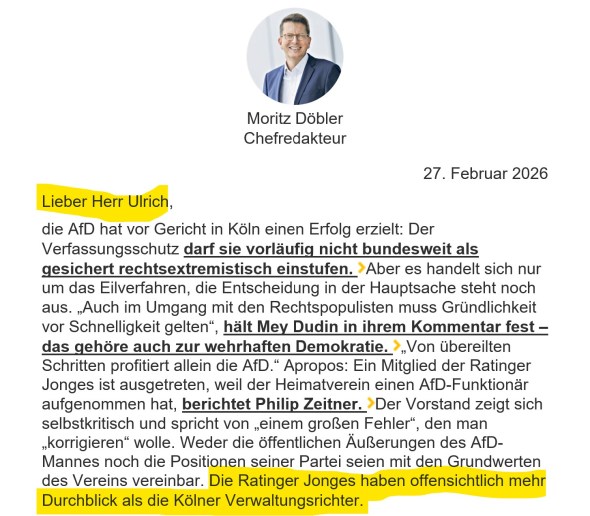 Veröffentlicht: 27. Februar 2026 Abgelegt unter: Tagebuch Hinterlasse einen KommentarLieber Herr Ulrich, so begrüßte mich Moritz Döbler, Chefredakteur der Rheinischen Post, in seiner heutigen Morgenbotschaft: