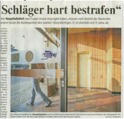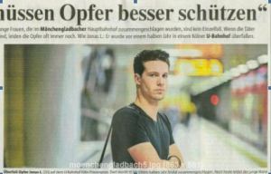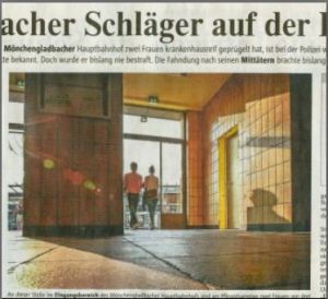 Wieder eine Fortsetzung! Die Redaktion, nun bestehend aus Gabi Peters und Christian Schwerdtfeger, tituliert mit dem Zitat: „Gladbacher Schläger hart bestrafen“. Und wieder ein hübsches Foto, diesmal die Eingangstür des Gladbacher Bahnhofs. Der Mann, der da gerade hinaus schlendert, hat offenbar mit der Tat nichts zu tun. Und es scheint sich auch nicht um den Polizeigewerkschaftler zu handeln, der sich in dem Artikel über die lasche Justiz beklagt.