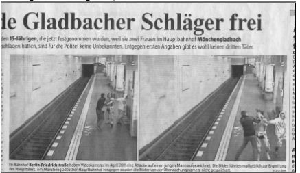 Fortsetzung von Christian Schwerdtfeger und Jürgen Stock: →Beide Gladbacher Schläger frei! Das wussten wir schon gestern. Aber leider keine Fortsetzung der hübschen Fotoserie vom Mönchengladbacher Bahnhof. Statt dessen als Placebo zwei historische Bilder aus Berlin. Passt irgendwie nicht so richtig, denn auf der abgebildeten Szene war zum einen der Täter (Torben P.) ein Deutscher und das Opfer zudem männlich. Und von Fußball keine Spur. Und das Opfer hatte sich zuvor auch nicht, wie die besagten Damen, als Spaßbremse betätigt.