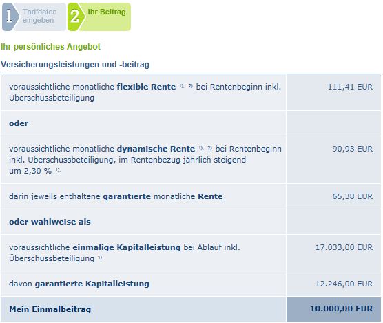 Im Folgenden das Beispiel, das jeder nachvollziehen kann. Unter der oben genannten Internet-Adresse gebe ich meine Daten ein. Ich will sofort 10.000€ einzahlen. Die erste Rentenzahlung soll nach 13 Jahren erfolgen:
