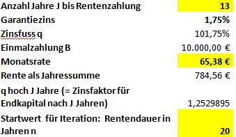Heraus kommt ein Angebot für eine lebenslange monatliche Rentenzahlung ab Alter x, frühestens aber ab Alter 60. Preisfrage: Wie alt muß ich werden, damit sich das lohnt? Oder anders herum: Wie viele Rentenzahlungen muss ich erhalten, um bei einer Verzinsung von 1,75% wieder auf den Barwert meines jetzt eingezahlten Kapitals, sagen wir mal 10.000€, zu kommen?