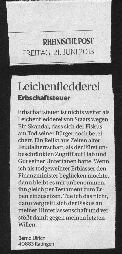Veröffentlicht: 23. Mai 2013 Abgelegt unter: Abzocke, Schwindel und Verbraucherrechte, Leserbriefe an Rheinische Post | Tags: Erbschaftssteuer 2 KommentareErbschaftssteuer ist nichts weiter als Leichenfledderei von Staats wegen. Ein Skandal, dass sich der Fiskus am Tod seiner Bürger noch bereichert. Ein Relikt aus Zeiten alter Feudalherrschaft, als der Fürst unbeschränkten Zugriff zu Hab und Gut seiner Untertanen hatte. Wenn ich als todgeweihter Erblasser den Finanzminister beglücken möchte, dann bleibt es mir unbenommen, ihn gleich per Testament zum Erben einzusetzen. Tue ich das nicht, dann vergreift sich der Fiskus an meiner Hinterlassenschaft und verstößt damit gegen meinen letzten Willen.
