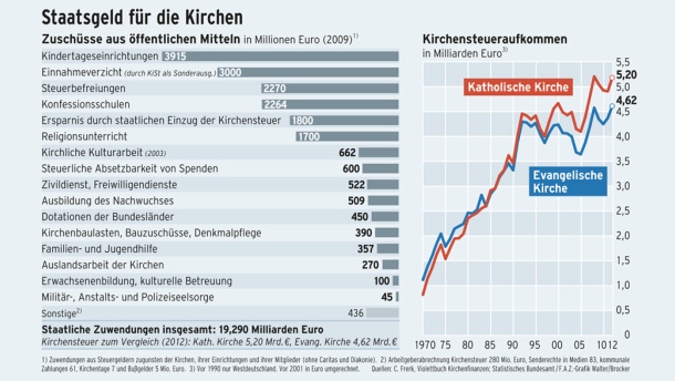 Genauso hanebüchen ist der Posten mit 1,8 Mrd. für den staatlichen Einzug der Kirchensteuer. Genau umgekehrt wird ein Schuh daraus. Denn jeder weiß, dass sich der Fiskus diese Dienstleistung mit ein paar hundert Millionen jährlich vergolden lässt. Geld, das  er vom Kirchensteueraufkommen direkt abzieht und in die eigene Tasche steckt.