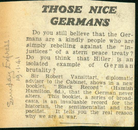 Sir Robert Vansittart, diplomatic adviser to the Cabinet, shows in a new booklet, “Black Record” (Hamish Hamilton, 6d.), that the German never alters. This booklet, a series of broadcasts, is an invaluable record for the historian, the sentimentalist and the pacifist. It tells you the real reason why we are at war.