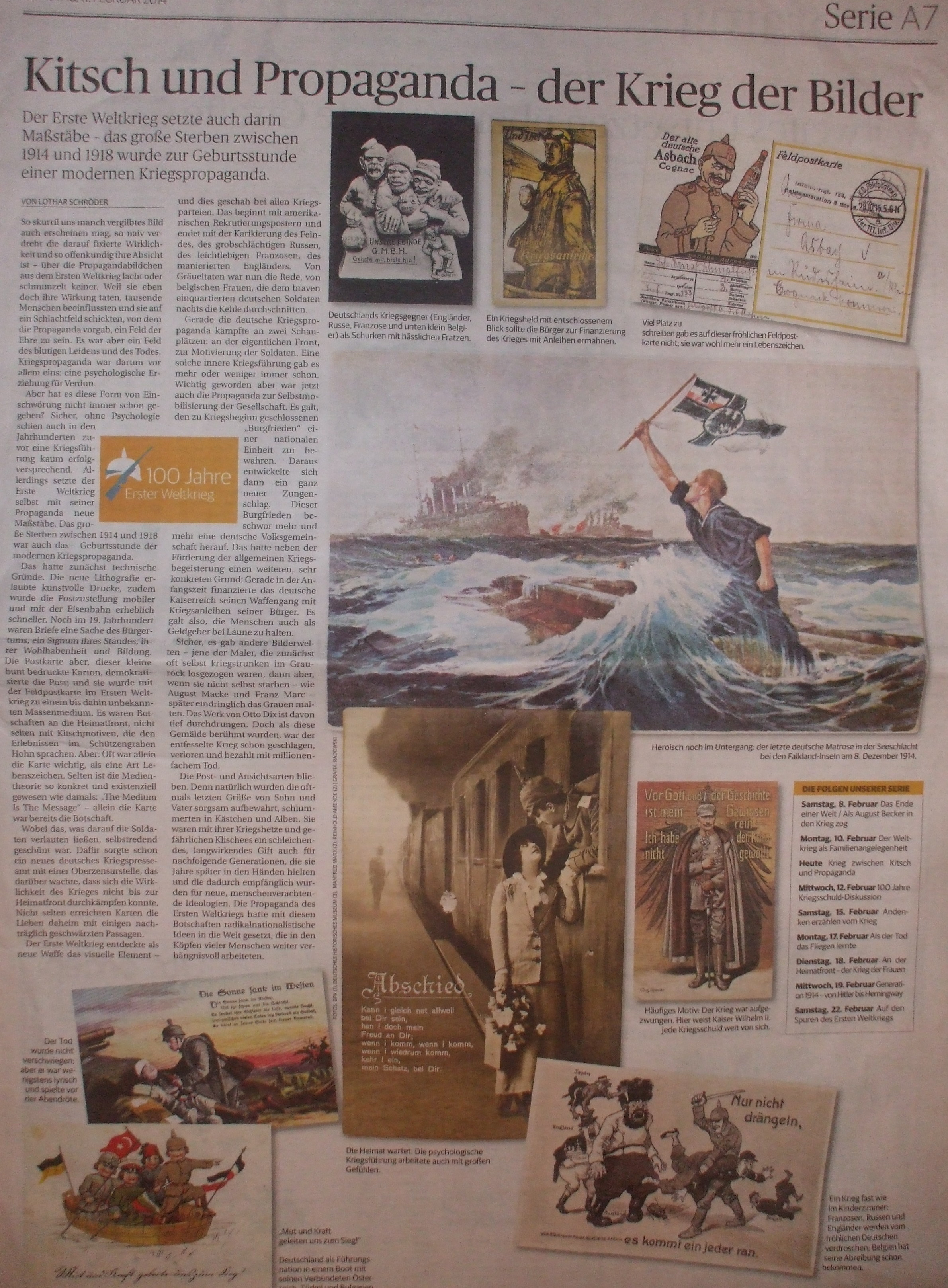 Veröffentlicht: 18. Februar 2014 Abgelegt unter: Deutsche Geschichte, Leserbriefe an Rheinische Post | Tags: Kitsch und Propaganda, Lothar Schröder Rheinische Post Hinterlasse einen KommentarAm 11. Februar 2014 brachte die Rheinische Post im Rahmen ihrer Reportagen zum „Jubiläumsjahr“ des Ersten Weltkriegs einen ganzseitigen Artikel von Dr. Lothar Schröder mit dem Titel: „Kitsch und Propaganda – der Krieg der Bilder“. Dieser Bericht war ausschließlich auf die deutsche Weltkriegspropaganda abgestellt. Zitat: „Sie waren mit ihrer Kriegshetze und gefährlichen Klischees ein schleichendes, langwirkendes Gift auch für nachfolgende Generationen, die sie Jahre später in den Händen hielten und die dadurch empfänglich wurden für neue, menschenverachtende Ideologien. Die Propaganda des Ersten Weltkriegs hatte mit diesen Botschaften radikalnationalistische Ideen in die Welt gesetzt, die in den Köpfen vieler Menschen weiter verhängnisvoll arbeiteten.“
