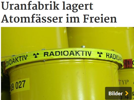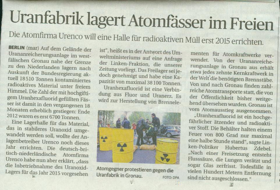Auf dem Gelände der Urananreicherungsanlage im westfälischen Gronau nahe der Grenze zu den Niederlanden lagern nach Auskunft der Bundesregierung aktuell 18 510 Tonnen kontaminiertes radioaktives Material unter freiem Himmel. Die Zahl der mit hochgiftigem Uranhexafluorid gefüllten Fässer ist damit in den vergangenen 18 Monaten erheblich gestiegen: Ende 2012 waren es erst 6700 Tonnen…Von und nach Gronau finden zahlreiche Atomtransporte statt, die von der Öffentlichkeit bisher weitgehend übersehen wurden. Gronau ist vom Atomausstieg ausgenommen. ..“Uranhexafluorid ist ein hochgefährlicher ätzender und radioaktiver Stoff. Die Behälter halten einem Feuer von 800 Grad nur maximal eine halbe Stunde stand“, sagte Linken-Politiker Hubertus Zdebel. „Nach einer Freisetzung entsteht Flusssäure, die Lungen verätzt und sogar Glas zerfrisst. Todesfälle in vielen Hundert Metern Entfernung sind nicht ausgeschlossen.“