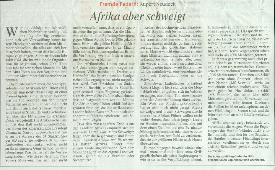 Apropos Afrika: In einem Gastbeitrag für die Frankfurter Allgemeine liest Rupert Neudeck, der Begründer der Hilfsorganisation Cap Anamur, den afrikanischen Potentaten gehörig die Leviten. Hier der volle Text: