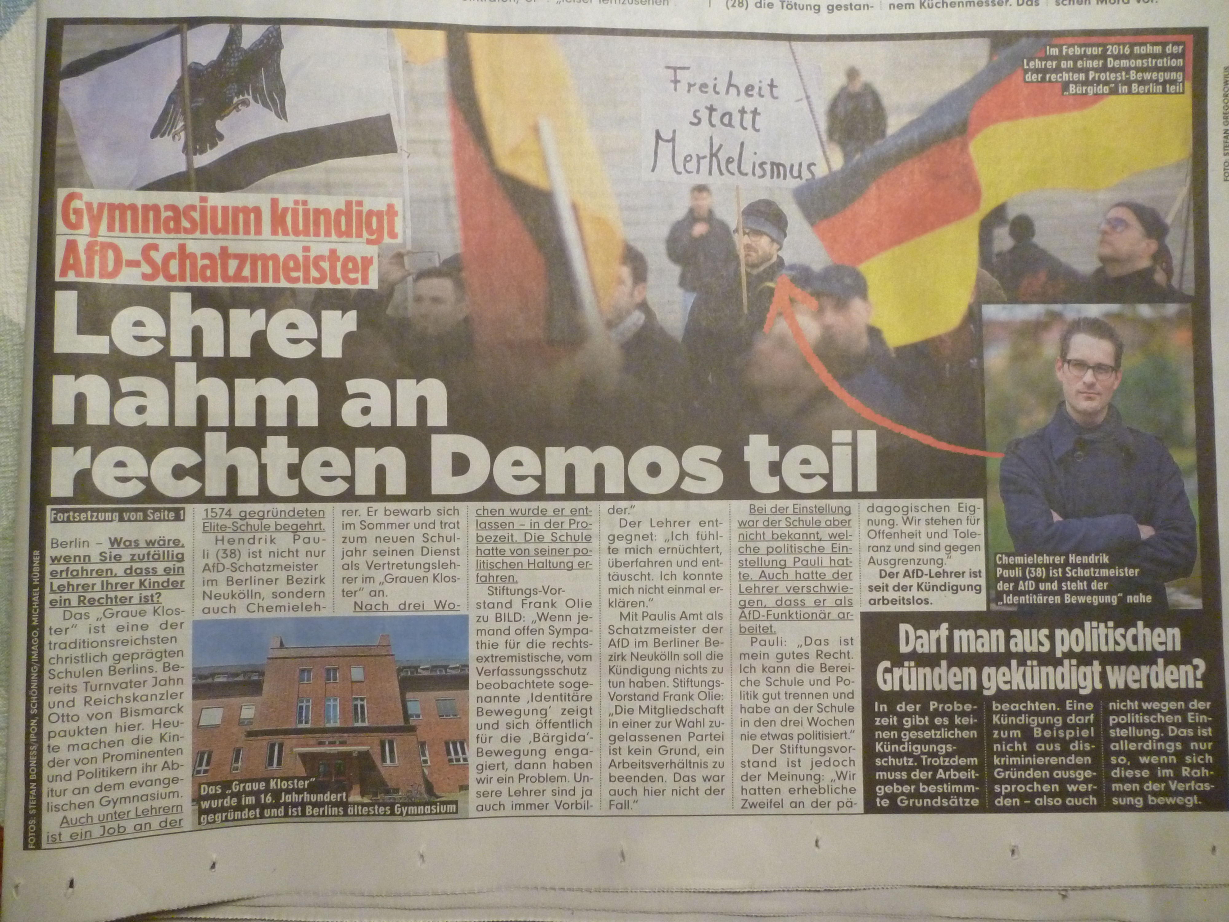 Gemach, gemach. Denn näheres erfährt nur der, der sich die Mühe macht und auf Seite fünf des Nackedei- und Revolverblattes die Fortsetzung der Geschichte liest: Besagter Chemie-Lehrer befand sich gerade mal drei Wochen in der Probezeit. Und es war auch keine staatliche Lehranstalt, sondern ein kirchliches Gymnasium. Und die Mitgliedschaft in der AfD sei kein Kündigungsgrund gewesen. Was die evangelischen Glaubensleute tatsächlich störte: Nicht nur, daß ihr neuer Pädagoge bei dem Berliner Pegida-Ableger Bärgida gesehen worden sei, nein er sympathisiere auch mit der „Identitären Bewegung“ und sei obendrein Schatzmeister der AfD in Berliner Bezirk Neukölln!