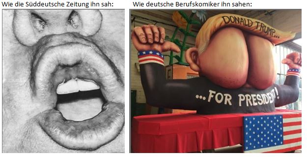 Dabei musste dem unbefangenen Beobachter auffallen, daß unsere Medien in den letzten Monaten nur Zerrbilder über Donald Trump verbreitet hatten. Kaum eine Abbildung, in dem der Kandidat der Republikaner mal in einer normalen Ansicht ohne Grimasse dem Publikum präsentiert worden wäre: