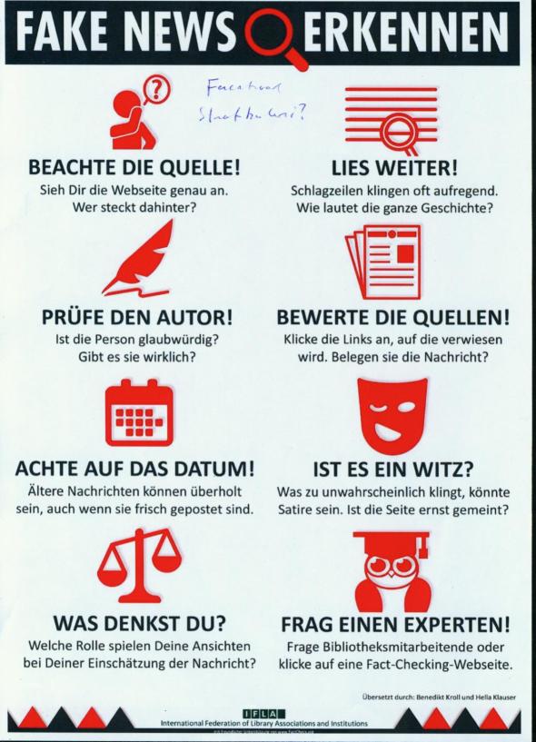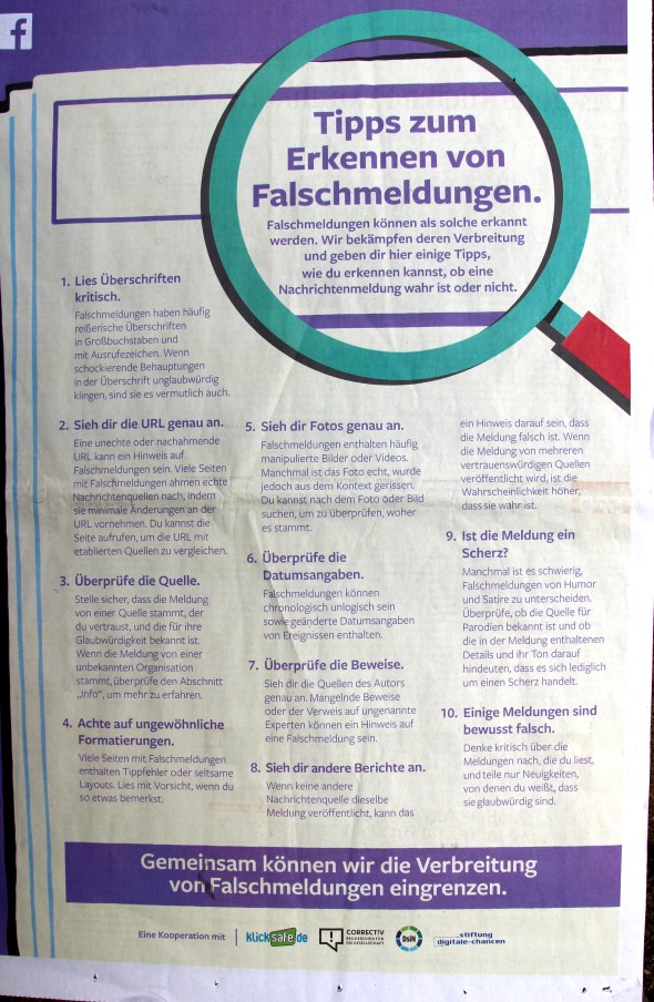 Fake News sind derzeit das Thema schlechthin. Letztens war ich auf einer SPD-Veranstaltung, wo über das Thema weitschweifig schwadroniert wurde. Ein Staatsekretär von Heiko Maas versuchte das neue Gesetz zur Kontrolle des Internet seinem unbedarften Publikum schmackhaft zu machen. Als Orientierungshilfe wurde den Genossen ein Blättchen zur Hand gegeben, das beim Erkennen von bösen Fake News Hilfestellung geben soll: