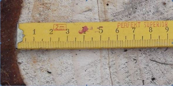 Die kräftigen Jahresringe, die nun sichtbar sind, zeigen daß die Zeder alles andere als durch Krankheit todgeweiht  war. Im Gegenteil, sie hatte in den letzten Jahren noch kräftig zugelegt.  Jahresringe von fast einen Zentimeter!
