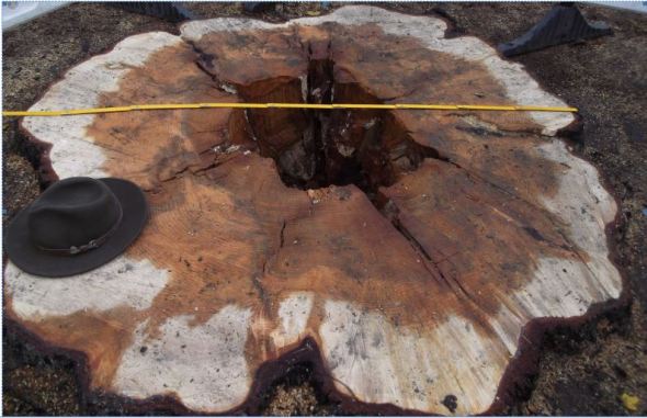Noch im Tod straft die alte Zeder ihre Feinde Lügen: Gerade mal ein Drittel des Stammdurchmessers, also nur etwa 15 Prozent der Querschnittsfläche,  waren dem Pilz zum Opfer gefallen.