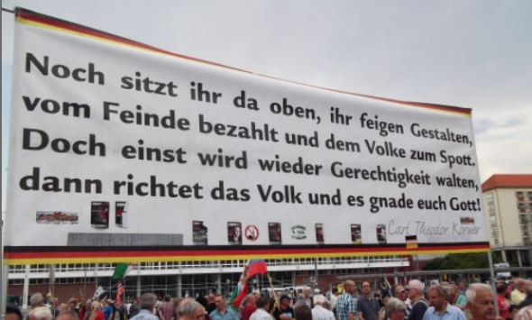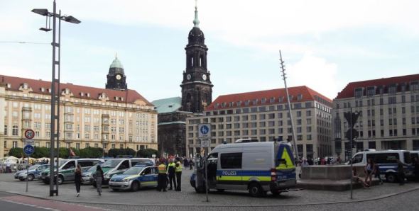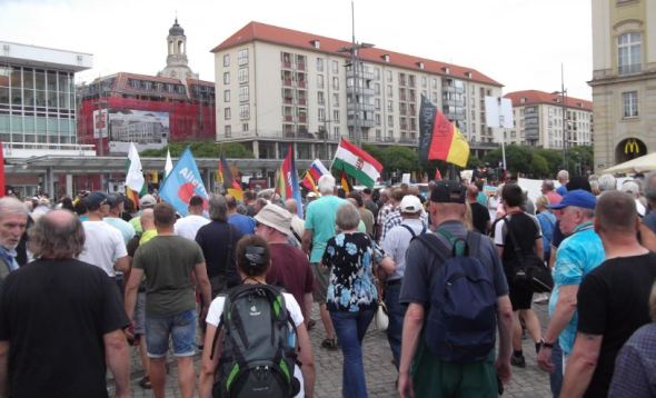 Wir nähern uns dem Altmarkt. Von weiten sehen wir die Mannschaftsbusse der Dresdner Polizei. Keine Hektik, alles erscheint ruhig. Auf dem Marktplatz selbst kein Gedränge, jede Menge freier Platz, es mögen einige hundert Demonstranten sein. Aus dem Lautsprecher ertönt Volksmusik, die melancholische Weise des „Rübezahlliedes“. Man unterhält sich und kommt ins Gespräch. Einige sind von weiter her angereist, auch aus dem europäischen Ausland. Die Gegendemonstranten? Ein etwas verlorenes Häuflein an Rande des Platzes, abgeschirmt durch die Polizei , es mögen etwa 30 gewesen sein, die drei große Transparente mangels Personal nur mit etwas Mühe aufspannen konnten.