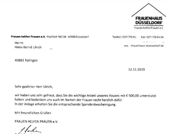 Es freut mich daher besonders mitteilen zu dürfen, daß der gemeinnützige Verein „Frauen helfen Frauen“ meine Spende zugunsten des Frauenhauses in Düsseldorf angenommen hat. Wie die Rheinische Post vor einiger Zeit berichtete, hatte der Sozialbund Katholischer Frauen und Männer in Mettmann seinerzeit meine Spende zurückgewiesen. https://rp-online.de/nrw/staedte/ratingen/afd-ratingen-kritisiert-ablehnung-einer-spende_aid-39179169. Bedauerlicherweise folgte auch der SKF Ratingen diesem Beispiel. Umso mehr freut es mich nun, daß mit dem Verein „Frauen helfen Frauen e.V.“ mein Beitrag zum Schutz von Frauen, die von häuslicher Gewalt bedroht sind, seine Zweckbestimmung gefunden hat.