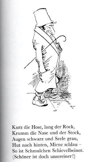 Doch, es wird noch schlimmer.  An anderer Stelle dieser Hetzschrift (vulgo: Wilhelm-Busch-Hausalbum) sammeln sich in der Figur des Schmulchen Schievelbeiner  nahezu sämtliche  antisemitischen Klischees: