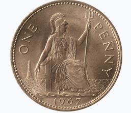 BRITANNIEN: Der Gegenpart zur Germania war die BRITANNIA. Ebenso kriegerisch, mit Helm und Dreizack: BRITANNIA rules the Waves. Der personifizierte Weltherrschaftsanspruch des britischen Empire in Gestalt einer Frau. Hier als Rückseite der One-Penny-Münze. Ab Anfang der siebziger Jahre verschwand dieses hübsche Symbol aus dem Münzumlauf. Britannia no longer rules the waves.