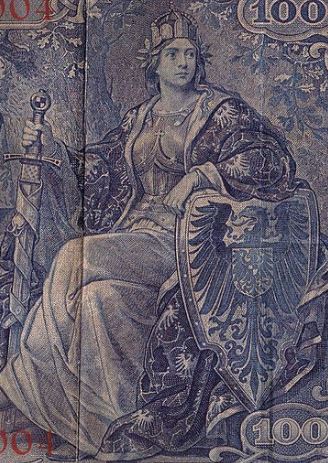 DEUTSCHLAND: Da hatten wir zu Kaisers Zeiten die GERMANIA. Zweifellos eine Frauengestalt, aber beileibe kein unterwürfiges Weibchen. Gross, kräftig, selbstbewusst mit Krone und Harnisch und doch mit weiblichen Proportionen. Sie verkörperte im wahrsten Sinne das damalige Deutschland.