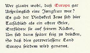Schlagen wir einen weiten Bogen zurück zu dem, was Mann und Frau verbindet. Noch vor wenigen Jahrzehnten hätte man geantwortet: Die Liebe. Die Liebe herrscht nicht, sie will nicht beherrschen, sie ist genügsam. Liebende sind froh, wenn sie nur die Nähe des anderen spüren. Liebe ist romantisch und am schönsten, wenn sie erwidert wird. Es braucht keine Erotik, bereits ein Händchenhalten oder eine zarte Umarmung begleitet die Liebenden in den siebten Himmel. – Dabei geht es nicht nur um Ernstes und Erhabenes: Was sich liebt, das neckt sich, so lautet eine alte Volksweisheit. Eugen Roths Büchlein „Frauen in der Weltgeschichte“ ist auf dem Einband geschmückt mit einer ganz anderen Darstellung der EUROPA: Lässig räkelt sich Europa auf ihrem knienden männlichen Gegenpart. Das ganze Buch mit seinen Versen ist eine herzliche Neckerei und damit nichts weiter als eine Liebeserklärung. Heute undenkbar. Schade, daß derlei in Vergessenheit geraten ist. Eine selbstzerstörerische, fanatische Ideologie, welche nichts weiter als Hass und Unfrieden sät und den Zusammenhalt der Gesellschaft spaltet in Arm und Reich, Jung gegen Alt, Kinder gegen ihre Eltern, Rechts und Links, Skeptiker gegen Gläubige, die hetzt auch Mann und Frau gegeneinander auf zum Geschlechterkampf. Fanatiker kennen keinen Humor. Die menschelnden Verse des bei den Nazis ungeliebten Humoristen Eugen Roth bleiben ihnen für immer fremd.