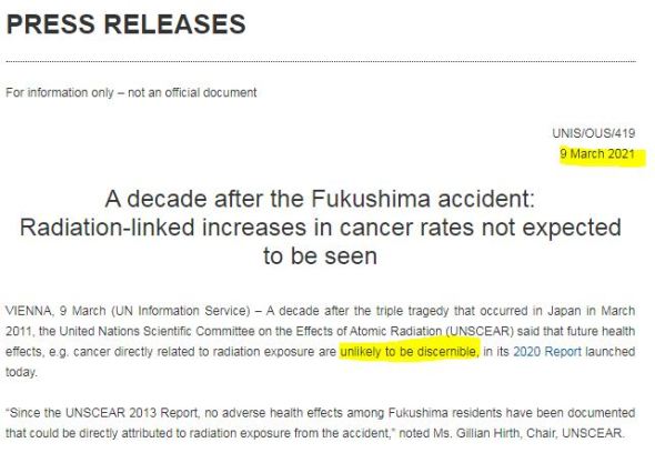 “A decade after the triple tragedy that occurred in Japan in March 2011, the United Nations Scientific Committee on the Effects of Atomic Radiation (UNSCEAR) said that future health effects, e.g. cancer directly related to radiation exposure are unlikely to be discernible, in its 2020 Report launched today.” “Since the UNSCEAR 2013 Report, no adverse health effects among Fukushima residents have been documented that could be directly attributed to radiation exposure from the accident,” noted Ms. Gillian Hirth, Chair, UNSCEAR.