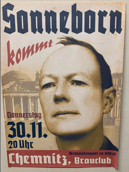 Wie erwähnt: Im Ratstrakt haben die ihre Bleibe direkt neben unseren Büro. Und da hängt seit Monaten ein uraltes Plakat an der Tür. Der Stil entspricht dem der dreißiger Jahre: Runenartige gotische Schrift, dazu ein kühner germanischer Recke, markantes Gesicht, entschlossener Blick. Klar, dieses Mannsbild hätte bei der Aktion Lebensborn sofort eine Dauerstellung als Befruchter erhalten. Sonneborn bei Lebensborn. Das hätte gepasst!