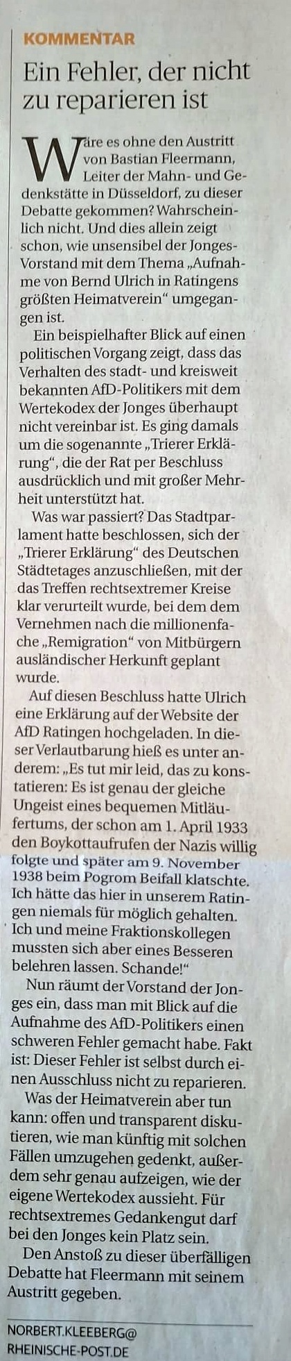 Veröffentlicht: 1. März 2026 Abgelegt unter: Leserbriefe an Rheinische Post, Politikversagen, Tagebuch | Tags: AfD Hinterlasse einen Kommentar(Bernd Ulrich)Na endlich! Nach über zwei Jahren hat der Lokalredakteur unsers Provinzblattes „Rheinische Post“ tatsächlich die Maske fallen lassen. Darunter kommt nun das Gesicht des „Haltungsjournalisten“ zum Vorschein. Haltungsjournalismus: Das genaue Gegenteil von seriöser Reportage. Nach über zwei Jahren Abstinenz, in denen über die Arbeit der Ratinger AfD kein Sterbenswörtchen in unserer Lokalpostille berichtet wurde, haut Herr Kleeberg so richtig rein. Aber schauen wir uns mal an, was er da präsentiert: „Das Stadtparlament hatte beschlossen, sich der „Trierer Erklärung“ des Deutschen Städtetages anzuschließen, mit der das Treffen rechtsextremer Kreise klar verurteilt wurde, bei dem dem Vernehmen nach die millionenfache „Remigration“ von Mitbürgern ausländischer Herkunft geplant wurde.“ Hier führt der Herr Lokalredakteur seine Leser bewusst und geschickt in die Irre. Denn inzwischen ist es gerichtsfest, dass bei den besagten Treffen keinesfalls über Vertreibungen oder gar Deportationen und auch nicht über die „Remigration“ deutscher Staatsbürger mit ausländischen Wurzeln gesprochen wurde. Kleeberg umschifft diese Klippe mit „dem Vernehmen nach“. Will sagen: Keine Festlegung, nur vom Hörensagen, ansonsten würde eine Abmahnung drohen. Aber Kleeberg unterschlägt noch weitere wesentliche Einzelheiten: Denn in der Trierer Deportationslüge, wie die „Erklärung“ sachlich korrekt zu bezeichnen wäre, findet sich gleich zu Beginn die ungeheuerliche Diffamierung: „Das jüngst bekannt gewordene Treffen von AfD-Funktionären mit Mitgliedern der Identitären Bewegung und die dort diskutierte Deportation von Millionen Menschen aus Deutschland hat uns alle schockiert.“ Das war schlichtweg gelogen. Durch mehrere Urteile wurde bestätigt: Die „Deportationen“ waren eine reine Erfindung schwarz-rot-grüner Politfunktionäre und willfähriger Medien. Inzwischen ist es laut Richterspruch statthaft, das Correctiv-Gespinst, das die Ratinger Kartellparteien gierig aufsogen und als „rassistische Deportationen“ in ihrer Vorlage weiterverbreiteten, als „dreckige Lüge“ zu bezeichnen.