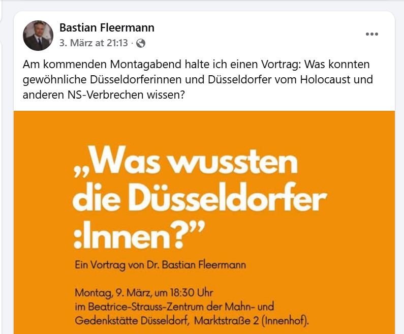 Ich war früh an dem Nachmittag in Düsseldorf um ja rechtzeitig zu kommen. Tatsächlich war ich einer der ersten. Das war auch gut so, denn die letzten mussten wegen Überfüllung des Raumes,  der etwa hundert Zuschauer fassen konnte, abgewiesen werden. Fleermann begann pünktlich mit seinem bebilderten Vortrag. Gleich zu Anfang reduzierte er die Erwartung: Tatsächlich wisse er nicht mit Bestimmtheit, was die Düsseldorfer in ihrer Mehrheit nun wirklich über den Holocaust wussten. Dann eine längere Einleitung über die Wahrnehmung im Nachkriegsdeutschland: Tabuisierung in den Fünfzigern, Sechzigern und Siebzigern, dann der Beginn einer Aufarbeitung Anfang der Neunziger nach der Wiedervereinigung: Genannt wurde die Ausstellung über „Verbrechen der Wehrmacht“, die Bücher von Peter Longerich, Götz Aly, Daniel Goldhagen.  Alles Autoren, deren Werke auch bei mir im Bücherschrank stehen und die den Nachweis versuchen einer kollektiven deutschen Mitwisserschaft, Billigung und Mittäterschaft am Holocaust. Ein konträres Werk, nämlich das von Alfred de Zayas: „Völkermord als Staatsgeheimnis“, fand allerdings keine Erwähnung. Nebenbei: Der Darstellung vom Tabu in den Sechzigern hätte ich widersprochen: Eichmann-Entführung und Prozess, Auschwitzprozess und die literarische Aufarbeitung durch Peter Weiss, Hochhuths „Stellvertreter“,  Paul Celans „Todesfuge“, die vergebliche Suche nach Josef Mengele: Das alles hatte uns als Gymnasiasten begleitet und bewegt. Die große „Schweigeverschwörung“ ist eine platte Erfindung späterer Jahrzehnte. Ob Bastian Fleermann, der erst Jahre nach Willy Brandts Kniefall in Warschau geboren wurde, sich dessen bewusst ist? Aber nein, ich wollte nicht nur den Vortrag nicht stören, sondern im Publikum unerkannt bleiben.