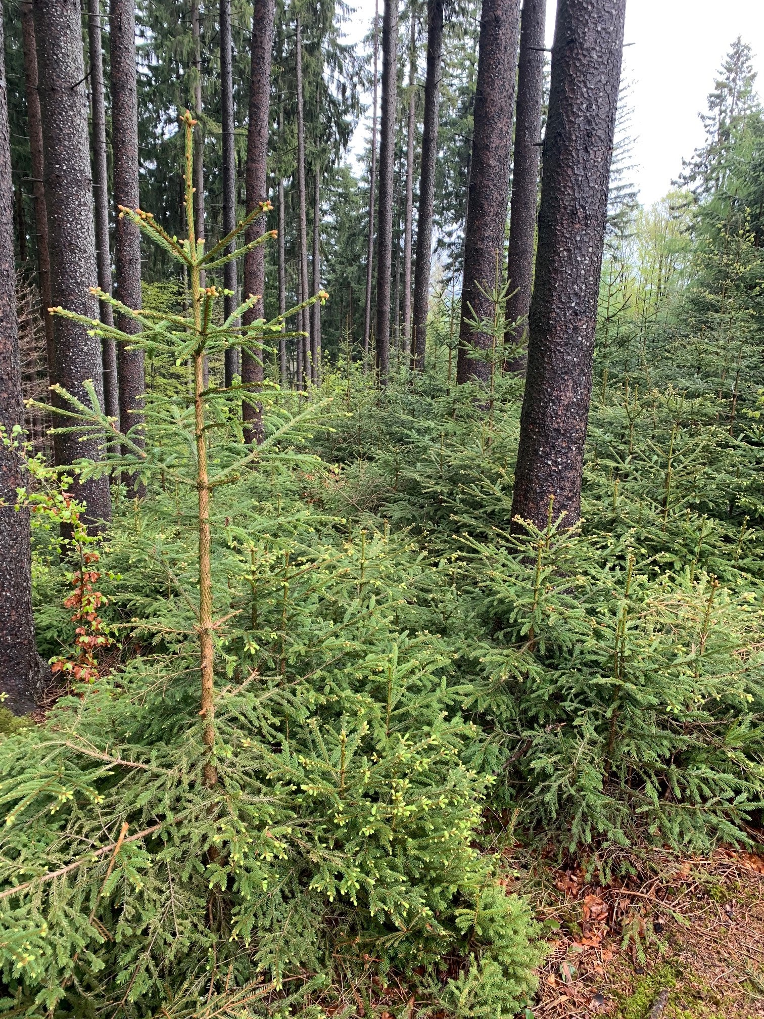 Hier mal ein Bild aus meinem Wald: Unter dem lockeren Kronenschirm hundertjähriger Fichten sprießt der Nachwuchs. Ganz von alleine, durch die Altbäume selbst ausgesät. Wenn die den Waldschadensbericht der Regierung lesen könnten, nach der vier von fünf Bäumen krank sein sollen: Meine Bäume würden sich krümmen vor Lachen. Statt dessen wachsen die gerade und kräftig gen Himmel: