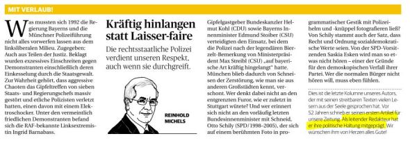 Ihr Chefredakteur schreibt heute, dass ein Chef einer Polizeibehörde immer erst dem Recht und dem Rechtsstaat verpflichtet ist – dies hätte er längst auch der Kanzlerin, immerhin Chefin der vollziehenden Gewalt, ins Stammbuch schreiben können – wenn bereits schon führende Staatsrechtler – leider im Ruhestand oder unabhängig – die Nichtbeachtung dieser Grundsätze beklagt und öffentlich gemacht haben.
