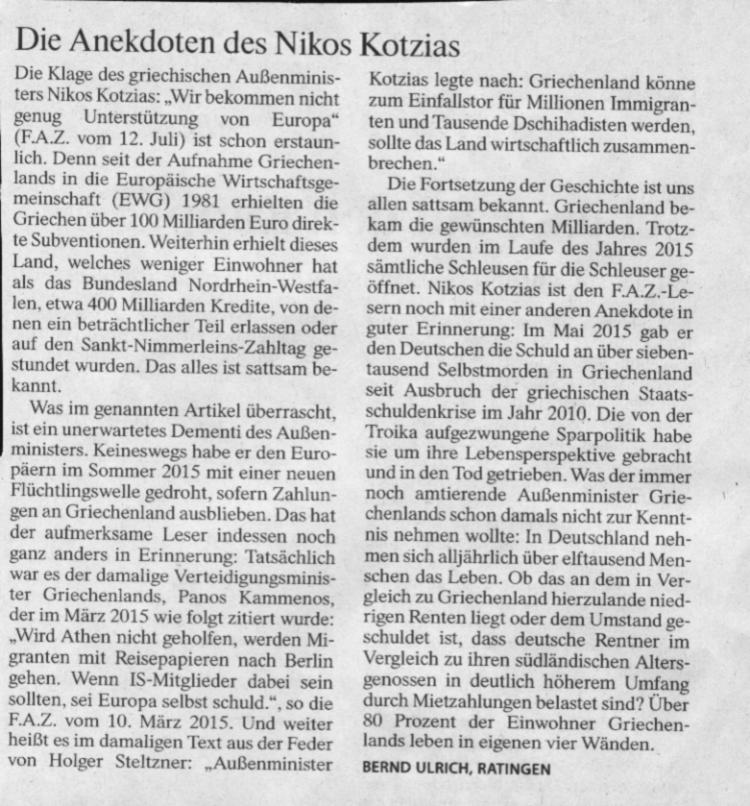 Was im genannten Artikel überrascht, ist ein unerwartetes Dementi des Außenministers. Keineswegs habe er den Europäern im Sommer 2015 mit einer neuen Flüchtlingswelle gedroht, sofern Zahlungen an Griechenland ausblieben. Das hat der aufmerksame Leser indessen noch ganz anders in Erinnerung: Tatsächlich war es der damalige Verteidigungsminister Griechenlands, Herr  Panos Kammenos, der im März 2015 wie folgt zitiert wurde: „Wird Athen nicht geholfen, werden Migranten mit Reisepapieren nach Berlin gehen. Wenn IS-Mitglieder dabei sein sollten, sei Europa selbst schuld.“,  so die FAZ vom 10.3.2015. Und weiter heißt es in damaligen Text aus der Feder von Holger Steltzner: „Außenminister Kotzias legte nach: Griechenland könne zum Einfallstor für Millionen Immigranten und Tausende Dschihadisten werden, sollte das Land wirtschaftlich zusammenbrechen.“