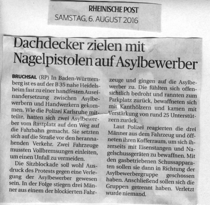 Lassen wir es bei dieser Auswahl. Sämtliche Kommentare sind hier: http://www.rp-online.de/panorama/deutschland/in-bruchsal-zielen-dachdecker-mit-nagelschussgeraeten-auf-asylbewerber-aid-1.6164402 nachzulesen. Einfach sortieren mit: „Älteste Kommentare zuerst„.